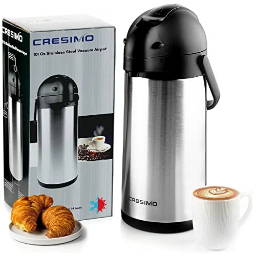 - COFFEE AIRPOT THAT STAYS HOT » With Cresimo’s coffee thermos, keep your drink piping hot for up to 12 hours or ice cold for up to 24 hours! Guaranteed using our durable 18/8 stainless steel carafe and lab-tested vacuum insulation technology.