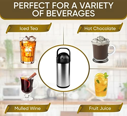 - EASY TO USE AND DURABLE » An airpot of your dreams – Simply push down on the pump on top and watch your favorite beverage come out the spout. Whether it be iced tea, hot chocolate, mulled wine, milk, or coffee, there is no limit! The stainless steel hot water dispenser has a base that conveniently rotates to easily turn in your direction without having to lift the urn.