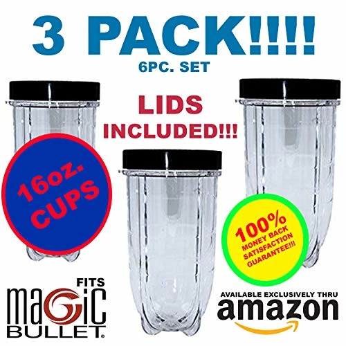 3 pack of 16oz Magic Bullet Blender replacement cups Need more storage cups for the WORLD’S FAMOUS MAGIC BULLET BLENDER? we provide the solution with this pack of cups to keep all your materials SAFE AND FRESH!!! This pack comes with THREE CUPS … LIDS INCLUDED in the 16oz size… the med size (not too big, not too small) Shipped in one compact box for easy handling, click “ADD TO CART” and start a new HEALTHY FOOD JOURNEY HERE!!!