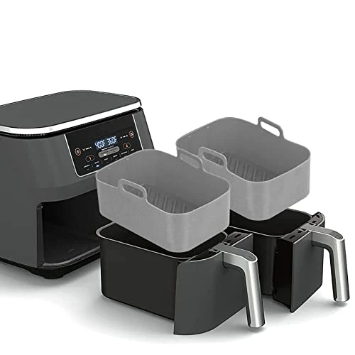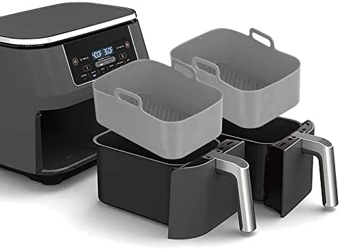 - โคใBetter choiceใ This air fryer silicone basket is specially designed with dozens of soft silicone lines for better air circulation and even heat distribution to cook your food crispy! The dimension is 7.67*5*2.75 inch, and it fits 8QT double basket air fryers.