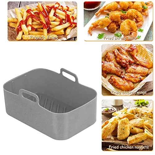 Our air frying silicone pot is made of reliable food-grade silicone material. And it is easy and convenient for usage and cleaning. Material: Silicone Color: blue/red/gray/Black Size: 19.5*12.7*7cm/7.67*5*2.75 inches Note: Please measure your air fryer before buying! Packing list: 2* air fryer silicone pot