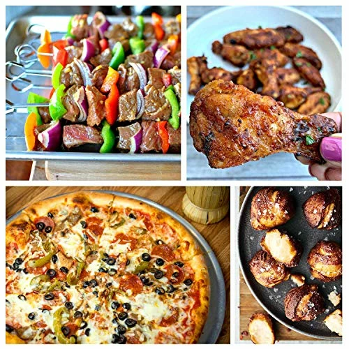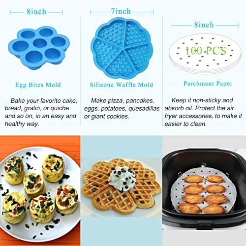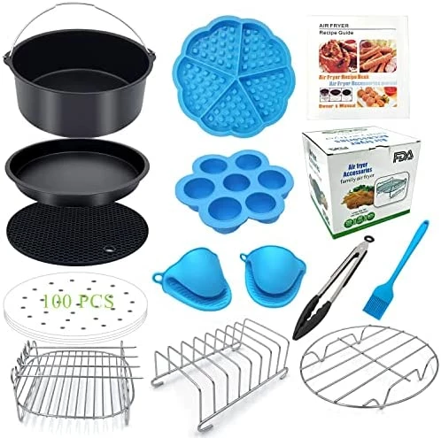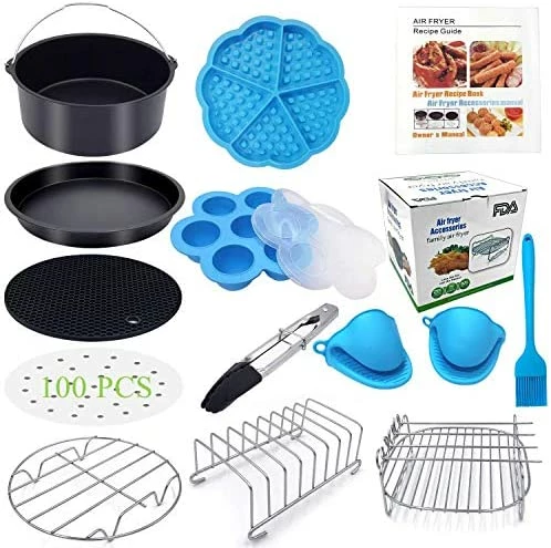- [12 pcs Air Fryer Accessories] This Air Fryer Accessories provide all you needs for delicious foods. Includeing: 1 Cake Barrel, 1 Pizza Pan, 1 Silicone Waffle Mold,1 Cupcake Pan, 1 Metal Holder, 1 Skewer Rack, 1 Toast Rack, 1 Silicone Mat, 2 Silicone Mini Mitts, 1 Food Tong, 1 Oil Brush, 100 pcs 8 inch Air Fryer Liners, And an air fryer Recipe Cookbook.These air fryer accessories can greatly expand your Ninja Foodi baking capabilities.