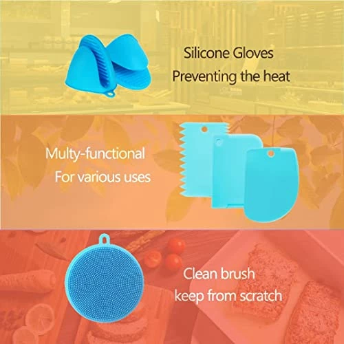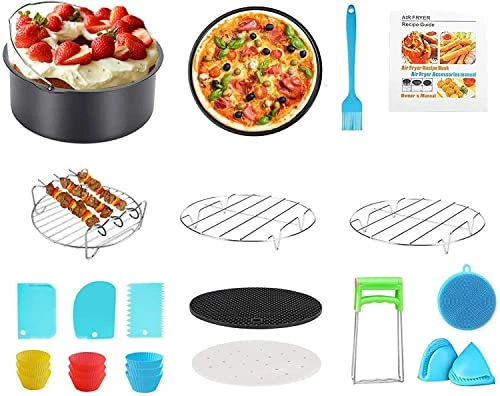 - 14pcs set:1*7inch cake pan,1*7inch pizza pan,2*7inch metal stand,1*multi-purpose skewer rack,1*air fryer cookbook,1*oil brush,9*silicone cups,1* dish clip,100 pieces of fryer liners, a pair of gloves, 1 * silicone mat,1* cleaning brush,1*Air Fryer Recipe Book,3pcs set cake knives,