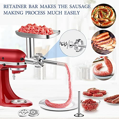 - ✩【Multifunctional Food Grinder Attachment】Food Grinder attachment greatly expands your KitchenAid stand Mixer’s flexiblity. Suitable for grinding meats, grating cheese, making bread crumbs, meatball, sausages, even make a large amount of mashed garlic, minced ginger paste or chili sauce.