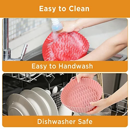 - ใEasy to Clean & Dishwasher Safeใ Lining a round silicone air fryer liners pot keeps your air fryer clean and enjoy delicious foods without burn and sticky. Dishwasher Safe, avoiding the trouble of hand washing. Large size:7.5 inch, fits 3 to 5 QT Air Fryers!
