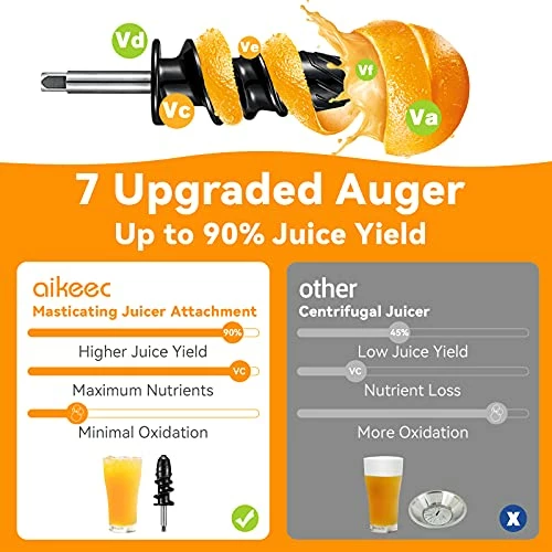 - ?ใUPGRADE SPIRAL SYSTEMใ – Aikeec cold press juicer attachment is equipped with a stronger upgraded 7-segment spiral drill, which can maximize the yield of juice, reduce oxidation, and retain the most nutrients. Perfectly separates the pomace from the juice.